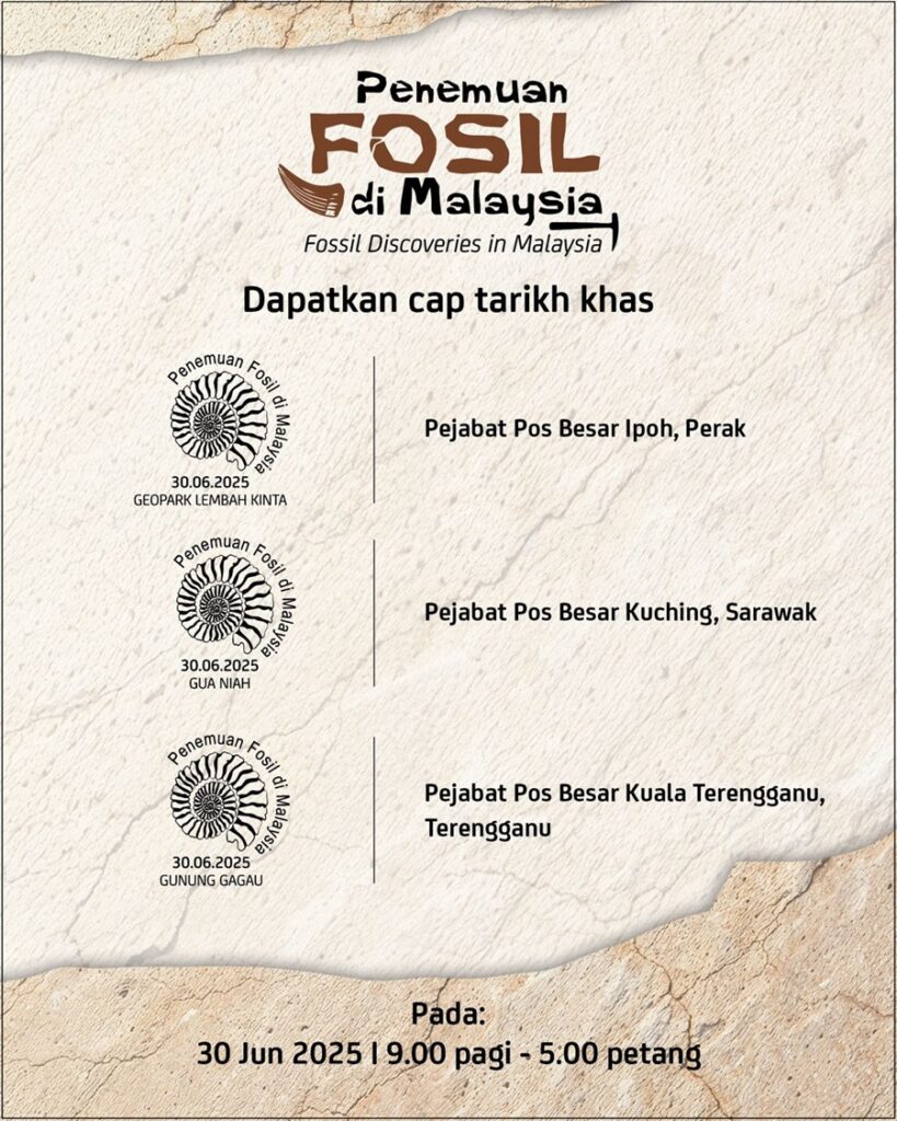 The Limited-Edition collection includes setenant stamps with four different designs, First Day Cover with stamps, and a folder. In conjunction with this release, three Pos Malaysia branches— GPO Kuching, GPO Ipoh, and GPO Kuala Terengganu—will offer special date cancellations on 30 June from 9am to 5pm featuring the fossil discovery locations in their respective states: Niah Cave, Kinta Valley Geopark, and Gunung Gagau.