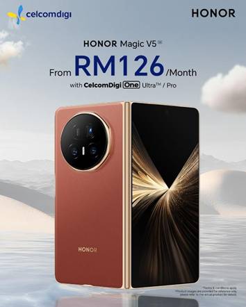 The HONOR Magic V5 from only RM126 per month with CelcomDigi One Ultra™ Pro. For more information about the postpaid plan, visit CelcomDigi’s official website.
