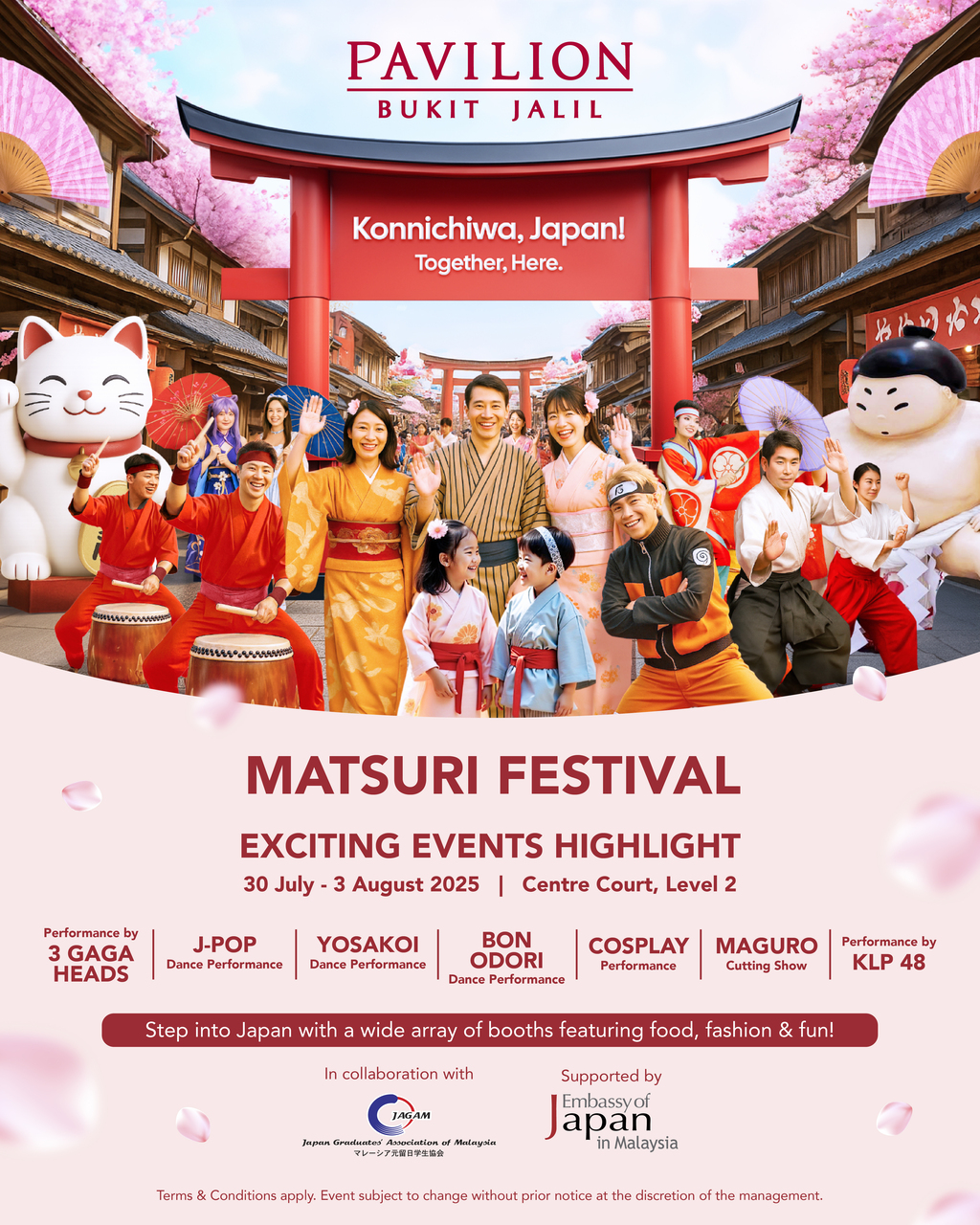 Before the MATSURI Festival from 30 July to 3 August, Pavilion Bukit Jalil will hold a Japan Fair by The Food Merchant from 17 July to 3 August in front of The Food Merchant, Japanese vendor booths in front of MUJI to Tokyo Town from 29 July to 3 August, and the launch of the main festival at Centre Court from 30 July to 3 August, offering visitors a rich and diverse Japanese experience throughout the mall.