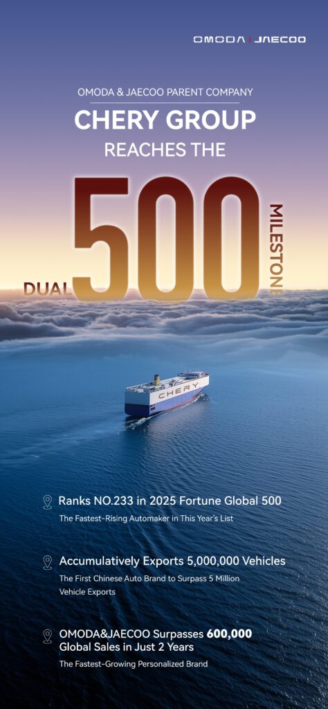 In July 2025, Chery International Group achieved a historic “Double 500” milestone, emerging as the fastest-rising automaker on both the Fortune Global 500 and the Fortune China 500 lists for the second consecutive year respectively. The Group now ranks 233rd globally (up from 385th in 2024) and 59th in China (up from 100th in 2024).