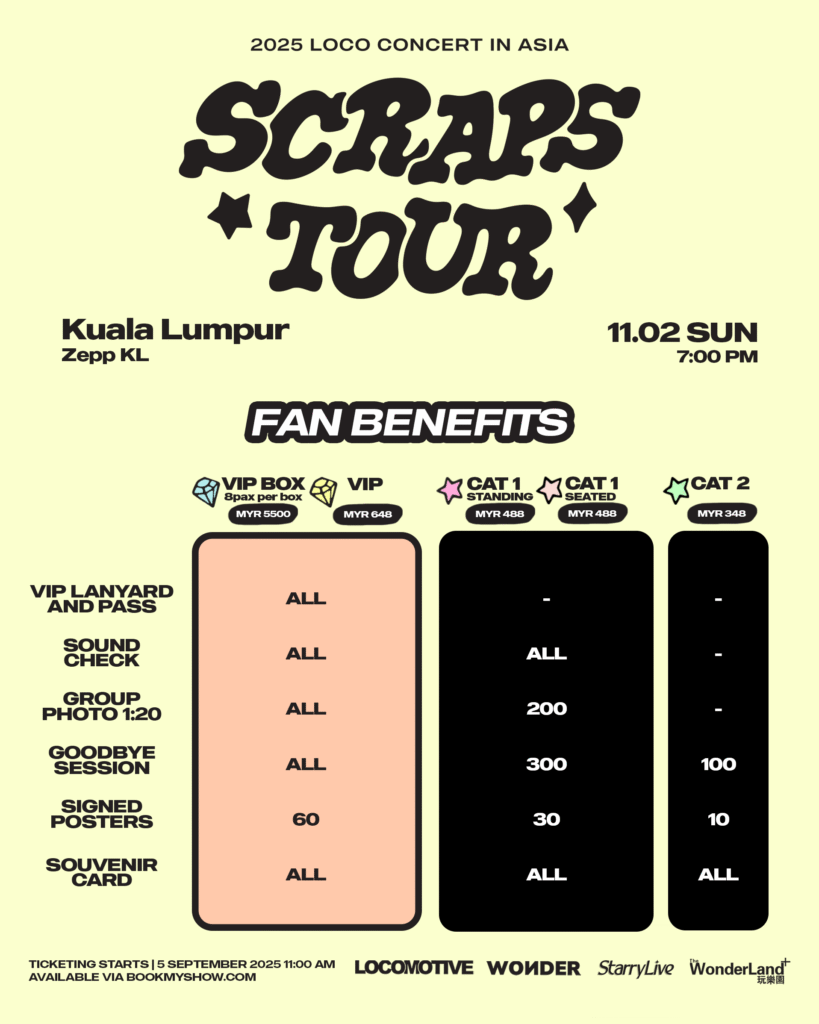 Jointly organised by Starry Live Entertainment and The WonderLand+, 2025 LOCO CONCERT: SCRAPS TOUR in KUALA LUMPUR will go loco at Zepp Kuala Lumpur this 2nd November 2025 (Sunday) at 7pm.
