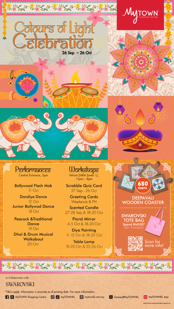 Throughout the month, shoppers of all ages are welcomed to participate in creative workshops inspired by Deepavali traditions, such as Floral Mirror making, Diya Painting, Scented Candle Crafting, and Table Lamp decorating. Accessible from only 25 points on the MyTOWNKL App, the workshops allow shoppers to craft unique pieces to take home.