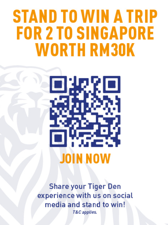 Fans who want to enjoy Tiger products at participating outlets, bars and pubs near them can stand to win the grand prize – a trip to Singapore for two pax worth RM30,000, or a Tiger Metal Cooler Box as the consolation prize worth RM350. Ten winners will be selected to receive the grand prize and the consolation prize is available for 2,500 winners! Those who are interested can visit the same website for more details.