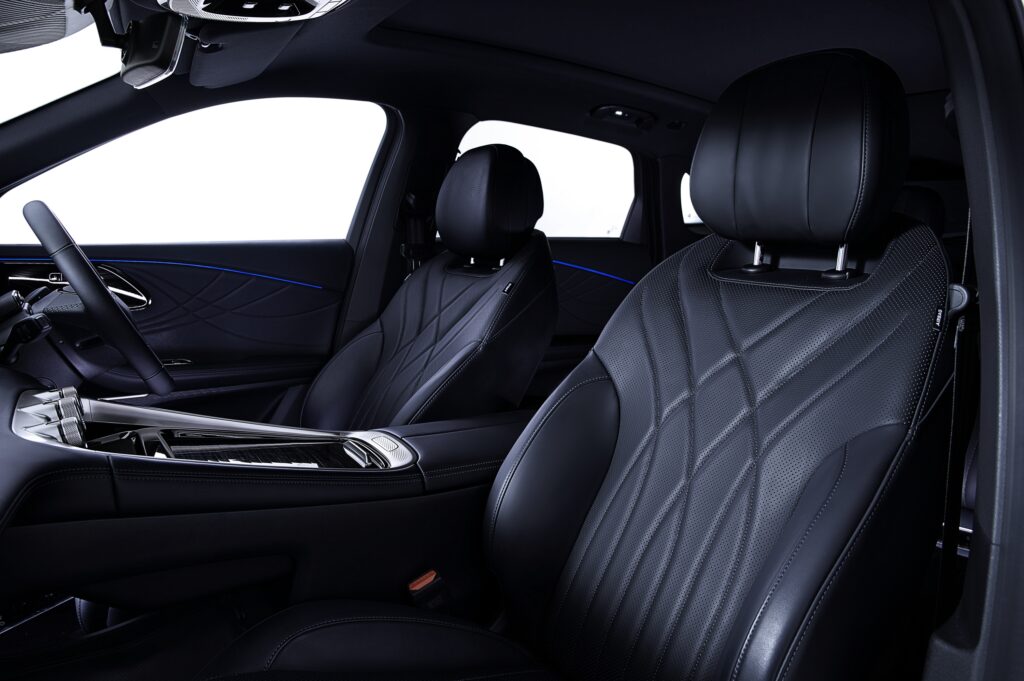 The spacious interior is appointed with premium black leather upholstery and refined material finishes, creating an elegant and contemporary space for both driver and passengers.