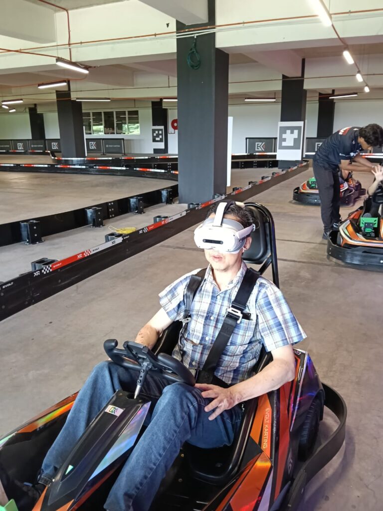 adventure. Drivers take the wheel of a real electric kart while navigating a completely virtual world through a VR headset, where digital landscapes, obstacles and competitive gameplay unfold in real time.