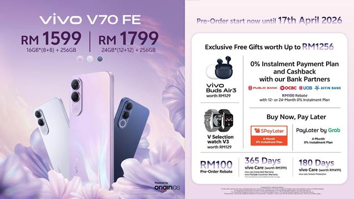 To enjoy the best value, vivo Malaysia is offering exclusive rewards for customers who pre-order the vivo V70 FE at all vivo Concept Stores and online from now until 17th April 2026. Customers will receive exclusive free gifts worth up to RM1,256, including vivo Buds Air3 and the V Selection Watch V3, along with 365 Days vivo Care Extended Warranty and 180 Days vivo Care Screen Protection. Customers will also enjoy an RM100 pre-order rebate during this period. Free gifts are available on a first-come, first-served basis while stocks last.