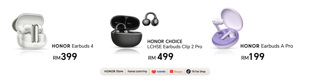For audio products, the HONOR Earbuds 4 retails at RM399, whereas the HONOR CHOICE Earbuds Clip 2 Pro is priced at RM499, while the HONOR Earbuds A Pro is priced at RM199. The HONOR CHOICE MouseBuds Pro is priced at RM359.