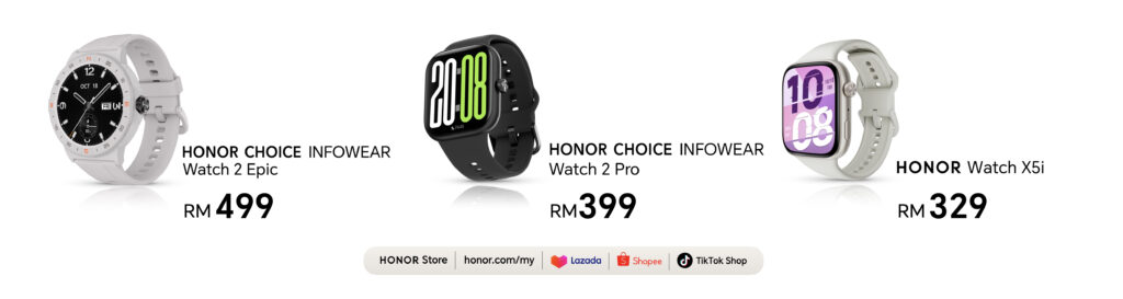 In the wearables segment, the HONOR CHOICE Watch 2 Pro is priced at RM399, while the HONOR Watch X5i is priced at RM329.
