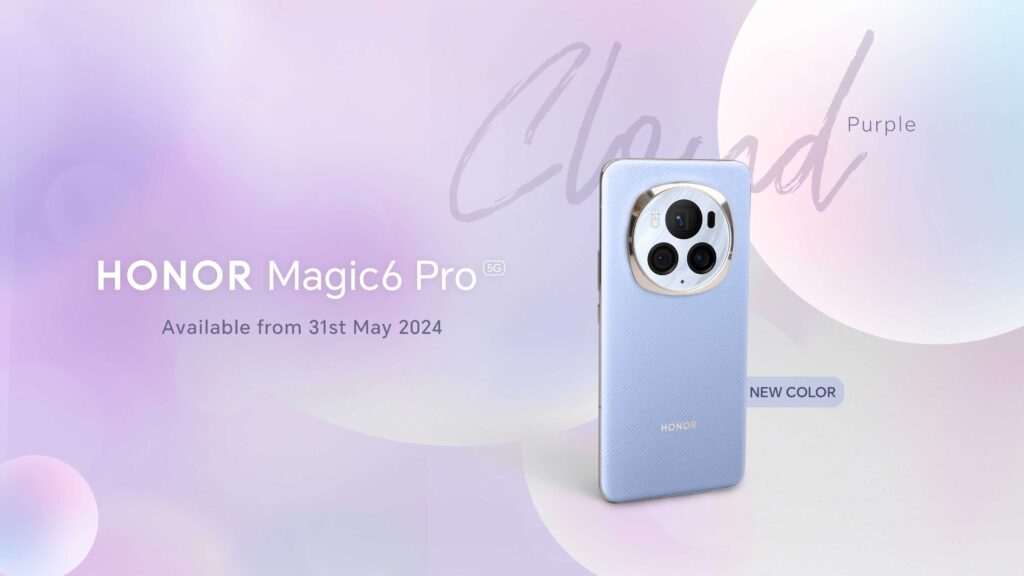 KUALA LUMPUR, 20 May 2024 – Following the success of its launch last March, the HONOR Magic6 Pro makes a return in a limited-edition variant of Cloud Purple. The beautiful Cloud Purple color is inspired by the sunrise at a lake, with soft lavender light reflecting on calm water and fluffy clouds drifting by. This flagship device is available for purchase starting May 31 at HONOR Experience Stores, authorized dealers nationwide and online platforms.