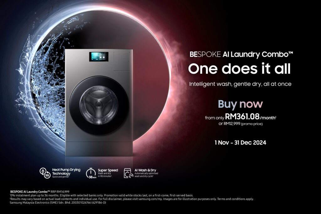 Samsung Malaysia Electronics today announced that it is launching the Bespoke AI Laundry Combo™[1] in Malaysia. First introduced at IFA 2023 in Berlin, the all-in-one washer and dryer combo is set to redefine laundry experiences by combining a washer and a dryer into a single space efficient appliance that finishes the wash and dry cycle in one queue. The Bespoke AI Laundry Combo™ also leverages advanced AI, and a 7” display to provide an easy, entertaining laundry experience.