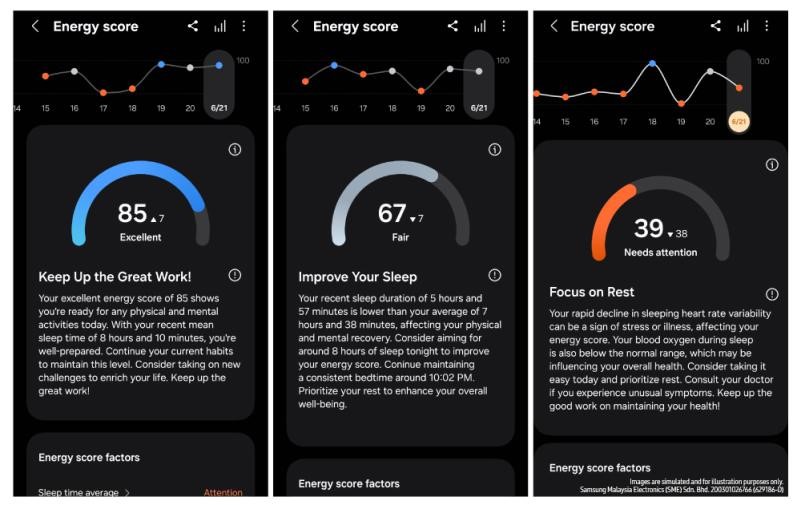 Stay committed to healthy habits during the day with Energy Score[5], a new Galaxy AI-enabled feature which is calculated based on a combined analysis of personal health metrics including sleep time average, sleep time consistency, bed/wake time consistency, sleep timing, previous day activity, sleeping heart rate and heart rate variability, which helps you understand your overall condition. Think of it as your report card, letting you know how you are doing, and where you can improve.