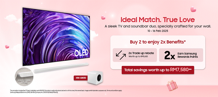 From today until 16 February 2025, elevate your gaming and entertainment experience with Samsung’s Ideal Match, True Love promotion[1]. Pair your Samsung OLED TV with selected soundbar and enjoy double the benefits[2], including: