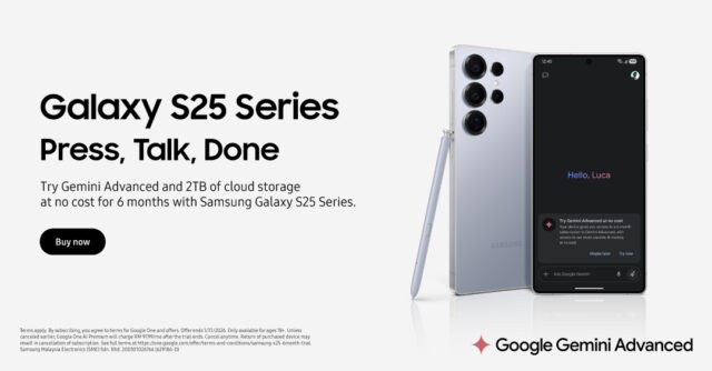 With the Samsung Galaxy S25 Series, users can now harness the full potential of this AI-driven revolution. From now until January 31, 2026, owners of the Galaxy S25, S25+, and S25 Ultra can enjoy a six-month trial of Google One AI Premium, which includes Gemini Advanced and 2TB of cloud storage at no cost.[1] After the trial period, the subscription will automatically renew at RM97.99 per month, unless cancelled.[2]