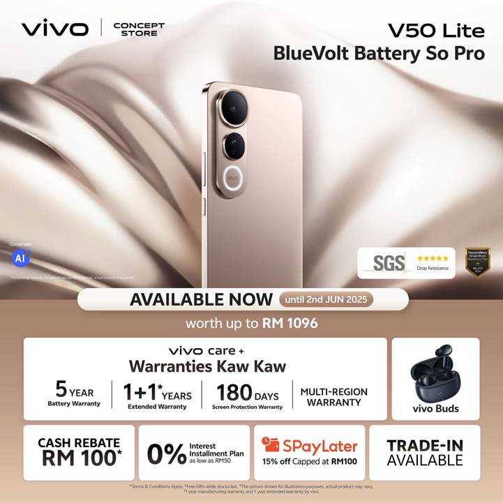 From now until 2 June 2025, customers who purchase the vivo V50 Lite 5G at a vivo Concept Store will enjoy a bundle of exclusive rewards: