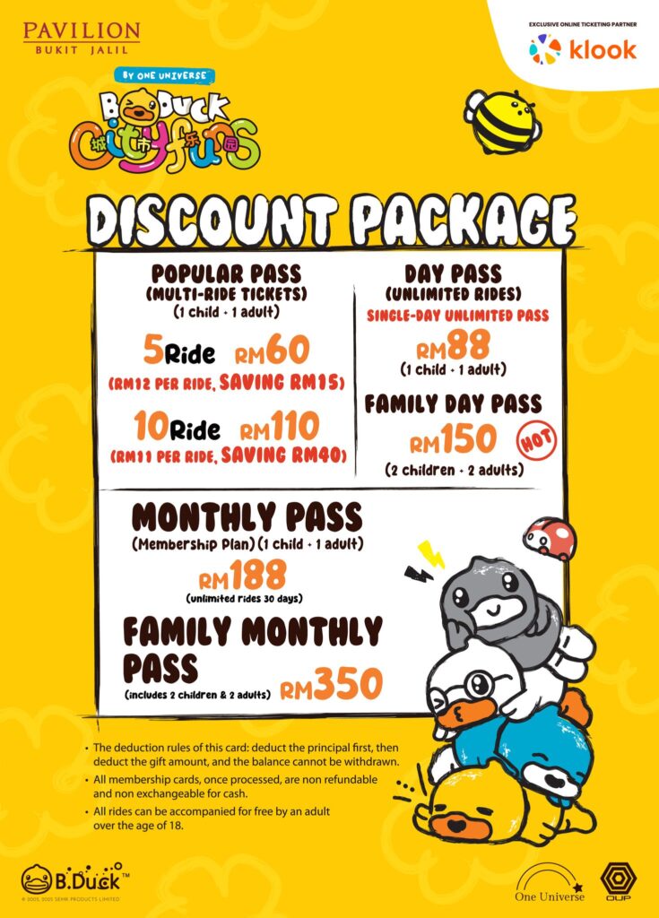 Tickets for B.Duck City Funs start from just RM15 per ride, with value-for-money packages such as the Family Day Pass, ideal for two adults and two children, priced at only RM150 for unlimited fun across multiple attractions all day. The theme park operates from 11:00am to 10:00pm, on Fridays to Sundays, and from 2.00pm to 10.00pm on Mondays, Wednesdays, and Thursdays. The park is closed on Tuesdays for scheduled maintenance and upkeep except for Public Holidays.