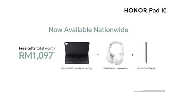 The HONOR Pad 10 is available nationwide from 30 May 2025 onwards, comes in color options of Cyan and Gray. The tablet can be purchased at stores nationwide for RM1,499 bundled with a FREE Smart Bluetooth Keyboard, HONOR CHOICE Pencil and HONOR CHOICE Active Noise Canceling Headphone total worth RM1,097.